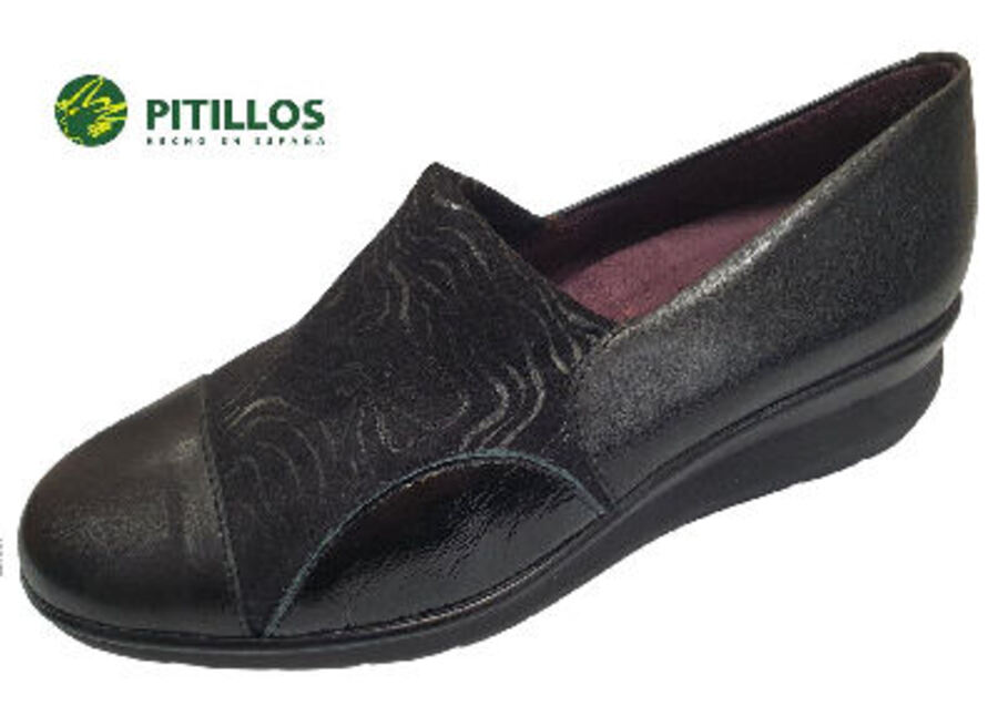 Low wedge dress slip-on with stretch embossed material for easy fit and a toe cap for added detail. A practical and stylish option for everyday or dress wear.